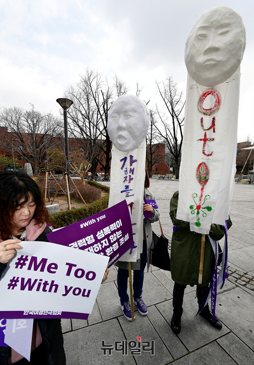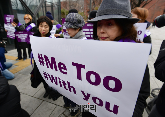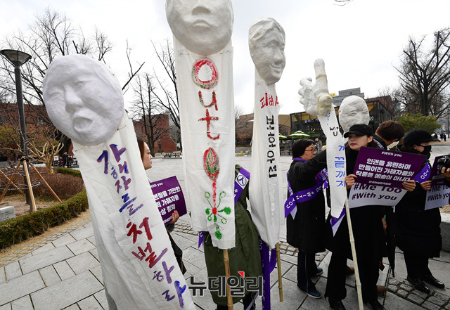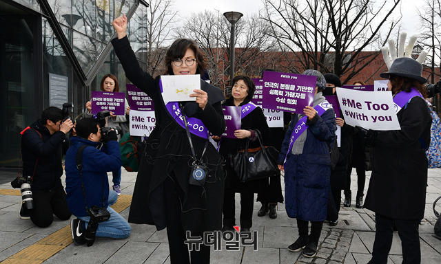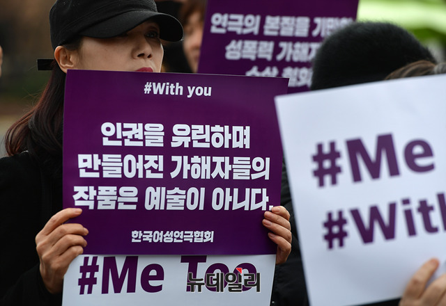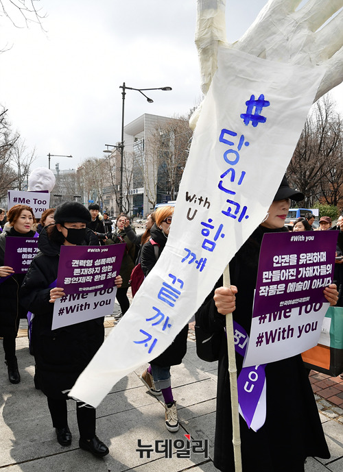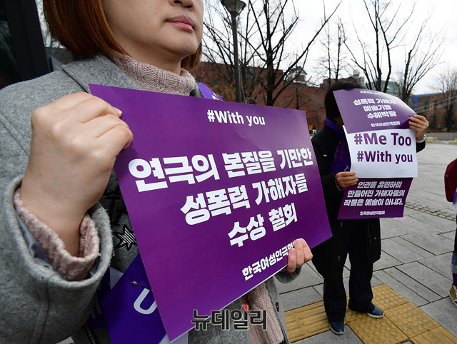류근혜 한국여성연극협회 회장을 비롯한 관계자들이 세계여성의날인 8일 정오 서울 종로구 대학로 마로니에공원 좋은공연안내센터 앞에서 연극계 성폭력 사태를 규탄하는 기자회견을 갖고, '미투'(#Me Too·나도 말한다) 운동을 지지하기 위한 가두행진을 진행했다.