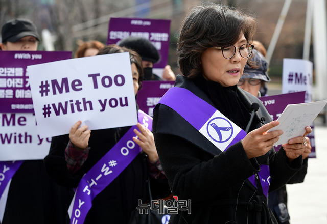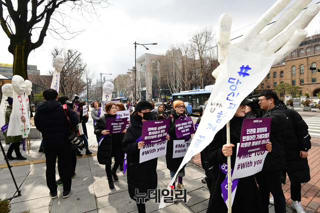 "미투(#Me_Too, 나도 말한다)를 하고 위드 유(# With you)를 외치는 용기 있는 연극인들, 오랜 세월 어둠 저편 가슴 속 깊이 묻어뒀던 그 상처를 이제라도 드러내주셔서 고맙다."류근혜 한국여성연극협회 회장은 8일 오후 12시 대학로 좋은공연안내센터 앞에서 연극계 성폭력 사태를 규탄하는 내용의 입장문을 낭독하며 성폭력 철폐에 앞장서겠다고 약속했다.한국여성연극협회는 '세계 여성의 날'을 맞아 연극계 성폭력 사태를 규탄하고 '미투' 운동을 지지하기 위해 혜화동 로터리, 성균관대입구 사거리 등 일대를 행진했다.이날 류근혜 회장은 "10년, 20년 전까지의 성적 훼손, 언어적물리적 폭력, 그로 인해 입은 상처가 발화되는 것을 보며 경악과 참담한 속에 할 말을 잃었다"며 목소리를 높였다.이어 "한국연극을 대표한다던 몇몇 연극인들이 괴물 혹은 일그러진 영웅이 돼버린 지금, 연극 현장에서 누군가는 가해자였고, 누군가는 침묵의 카르텔 속에 방관함으로써 잠재적 가해자가 됐다. 이제 연극인 스스로를 성찰하고, 반성하고, 변화해야 한다"고 강조했다.또, 미투 폭로자들에 대해 "한국 연극의 감춰져 있던 환부를 당신의 발화를 통해 깨닫게 됐다. 당신의 상처를 더 일찍 알지 못했고 더 일찍 보듬지 못해 죄송하다"고 말했다.