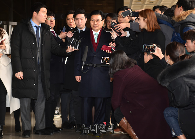 홍문종 자유한국당 의원이 9일 오전 서울 서초구 서울중앙지검에 사학재단을 통한 불법 자금 수수 의혹 관련 피의자로 출석에 앞서 기자들의 질문에 답하고 있다.