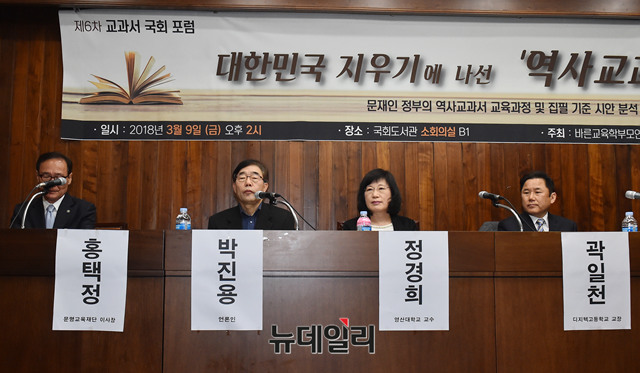 '대한민국 지우기에 나선 '역사교과서 시안' 토론회가 9일 오후 국회 도서관에서 열리고 있다. 이날 토론회에는 홍택정 문명교육재단 이사장,곽일천 디지텍고 교장, 정경희 영산대 교수, 박진용 언론인 등이 참석해 자리를 빛냈다.