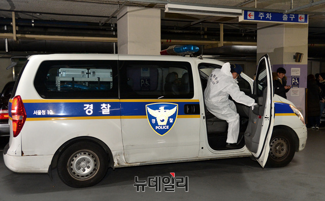 광진경찰서 과학수사대가 9일 오후 배우 조민기가 숨진 서울 광진구의 한 아파트 주차장 옆 창고에서 증거품을 수거하고 있다.