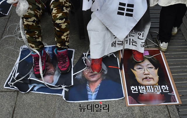 [포토] 문재인 대통령과 이정미 전 헌법재판관 사진 밟고 있는 집회 참가자들