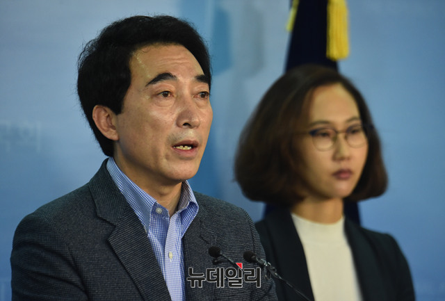 충남도지사 선거에 출마한 더불어민주당 박수현 전 의원이 11일 오전 국회 정론관에서 기자회견을 갖고 내연관계의 여인을 지방의원 비례대표로 공천했다는 의혹에 대해 해명하며 울먹이고 있다.