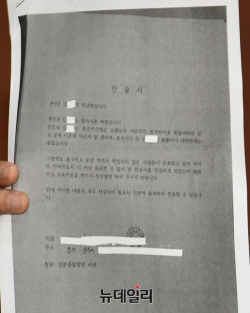 충남도지사 선거에 출마한 더불어민주당 박수현 전 의원이 11일 오전 국회 정론관에서 내연관계의 여인을 지방의원 비례대표로 공천했다는 의혹 관련 기자회견 마치고 내연녀로 지목된 김영미 공주시의원 전 남편 진술서를 기자들에게 보여주고 있다.