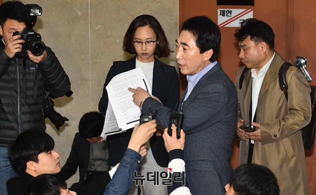 충남도지사 선거에 출마한 더불어민주당 박수현 전 의원이 11일 오전 국회 정론관에서 내연관계의 여인을 지방의원 비례대표로 공천했다는 의혹 관련 기자회견 마치고 기자들의 질문에 답하고 있다.