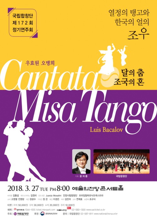 국립합창단은 제172회 정기연주회(신춘음악회) '열정의 탱고와 한국의 얼의 조우'를 오는 27일 오후 8시 예술의전당 콘서트홀에서 공연한다.