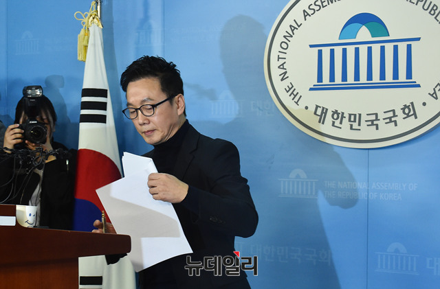 지지자를 성추행 했다는 의혹을 받고 있는 정봉주 전 의원이 12일 오전 국회 정론관에서 논란에 대한 해명 기자회견을 마치고 회견장을 떠나고 있다. 정 전 의원은 지난 7일 6.13 지방선거 서울시장 출마 기자회견을 돌연 연기했다.