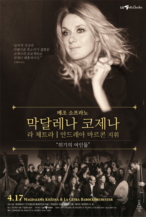 막달레나 코제나는 이탈리아의 바로크 음악 거장 안드레아 마르콘(55)과 그가 이끄는 바로크 앙상블 라 체트라와 함께 '위기의 여인들'이라는 주제로 4월 17일 LG아트센에서 내한공연을 갖는다.