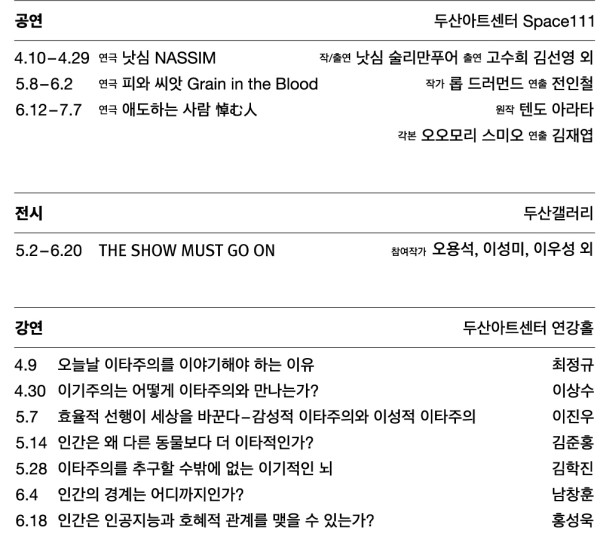 두산인문극장은 올해 '이웃과 어떻게 함께 살 것인가?'라는 질문에 대해 관객들과 고민해본다. 우리는 인간의 어떤 행위를 이타적인 것이라고 볼 것인지, 희생은 어떤 지점에서 발생하는지, 그 희생을 진정으로 값어치 있는 것으로 만들 방법을 모색할 예정이다.