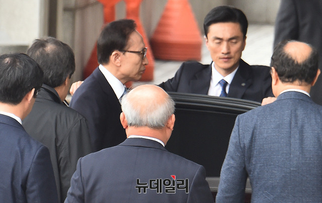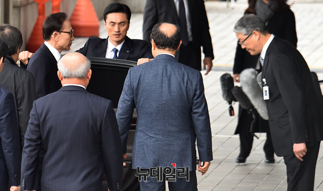 뇌물수수-조세포탈 등의 혐의를 받고 있는 이명박 전 대통령이 14일 오전 서울 서초구 서울중앙지검에 도착해 차량에서 내리고 있다.