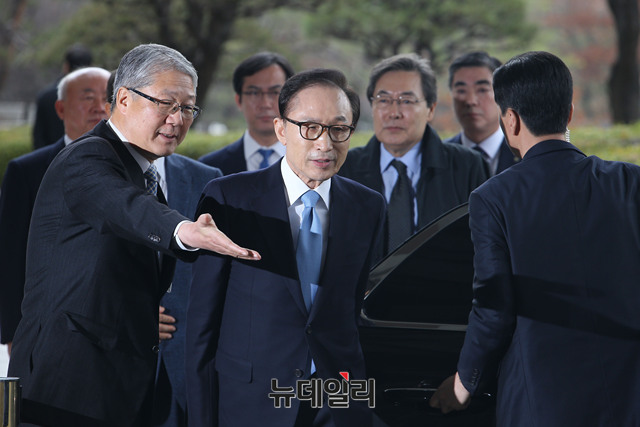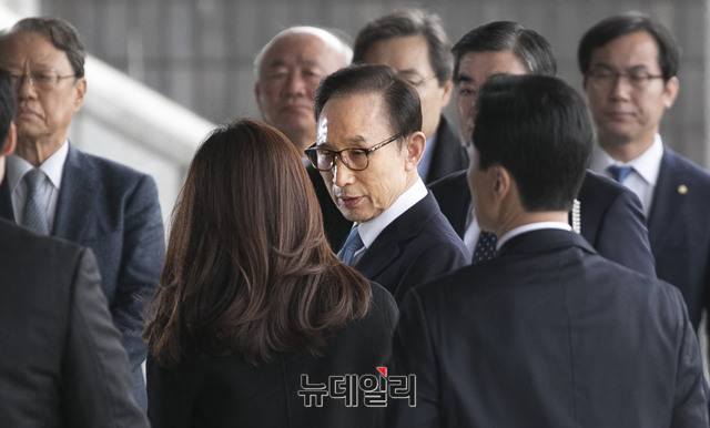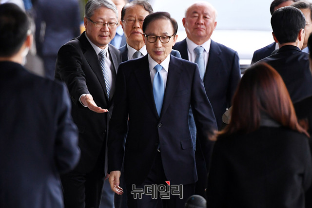 이명박 전 대통령이 14일 오전 피의자 신분으로 서울 서초구 서울중앙지검에 출석하고 있다. 이 전 대통령은 뇌물수수, 횡령, 조세포탈 등 혐의를 받고 있다. (사진=사진공동취재단)