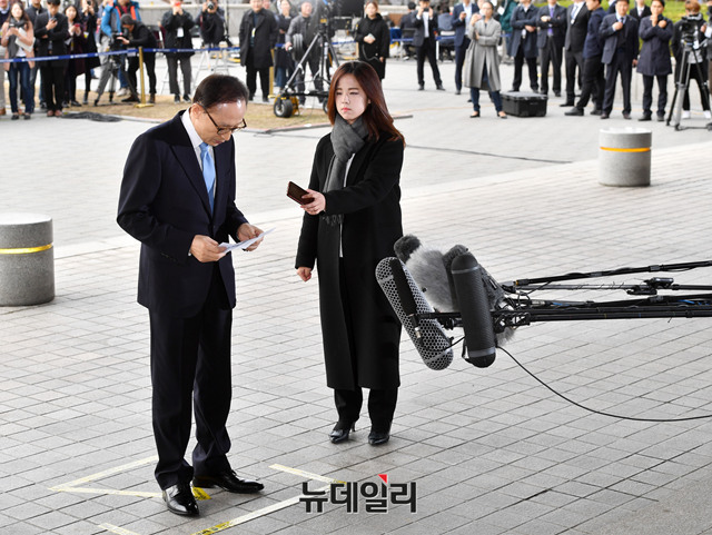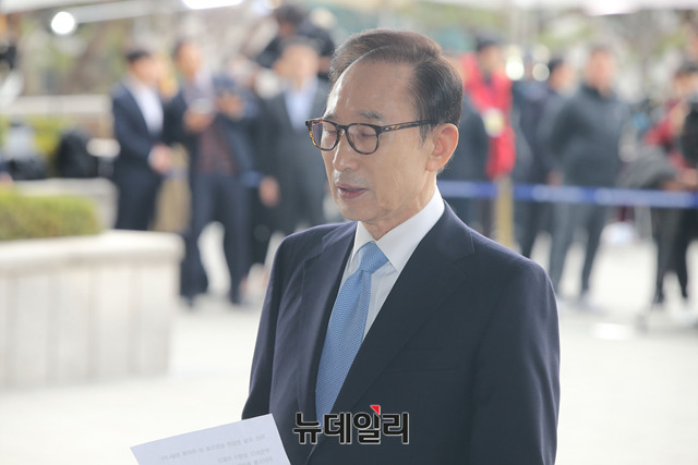 이명박 전 대통령이 14일 오전 피의자 신분으로 서울 서초구 서울중앙지검에 출석에 앞서 대국민 입장문을 발표하고 있다. 이 전 대통령은 뇌물수수, 횡령, 조세포탈 등 혐의를 받고 있다. (사진=사진공동취재단)