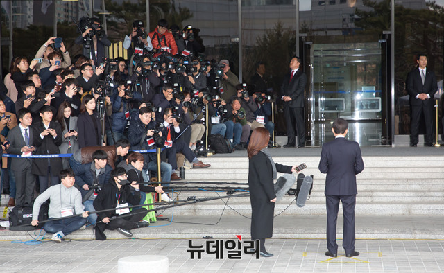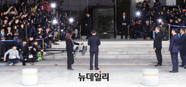 [포토] 검찰 포토라인에 선 이명박 전 대통령