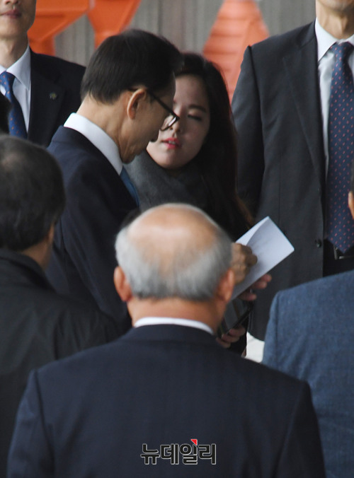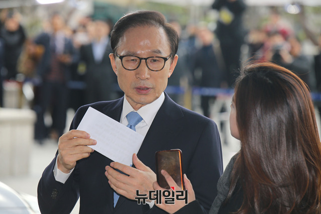 이명박 전 대통령이 14일 오전 피의자 신분으로 서울 서초구 서울중앙지검 출석에 앞서 기자들의 질문에 답하고 있다. 이날 이 전 대통령은 "저는 오늘 참담한 심정으로 이 자리에 섰습니다. 무엇보다도 민생경제가 어렵고 한반도를 둘러싼 안보환경이 매우 엄중할 때 저와 관련된 일로 국민 여러분께 심려를 끼쳐드려서 대단히 죄송합니다. 또한, 저를 믿고 지지해주신 많은 분들과 이와 관련해서 어려움을 겪고 있는 많은 분들에게도 진심으로 미안하다는 말씀을 드립니다. 전직 대통령으로서 물론 하고 싶은 이야기도 많습니다마는 말을 아껴야 한다고 스스로 다짐하고 있습니다. 다만 바라건대 역사에서 이번 일로 마지막이 됐으면 합니다. 다시 한 번 국민 여러분들께 죄송스럽다는 말씀을 드립니다."라며 대국민 메세지를 발표했다.