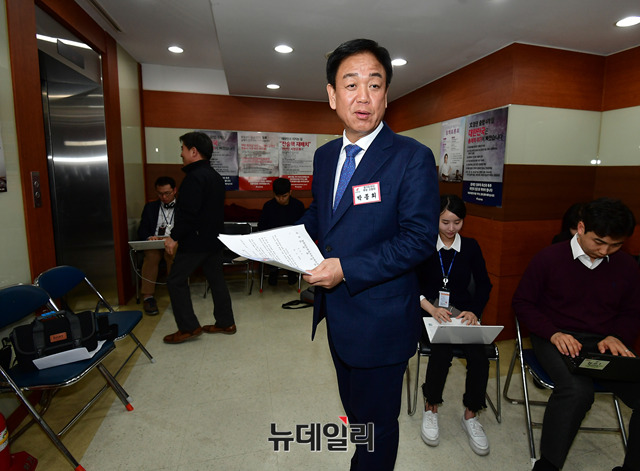 박종희 자유한국당 6.13지방선거 경기지사 예비후보가 14일 오후 서울 여의도 자유한국당사에서 진행된 광역단체장 후보자 면접 직후 취재진들의 질문에 답하고 있다.