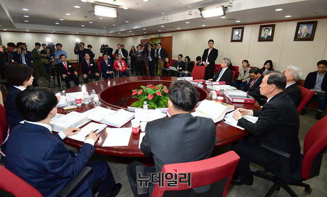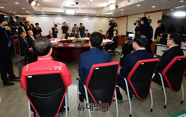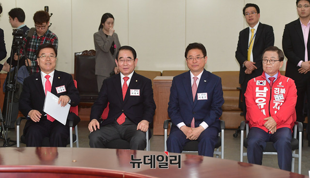 김광림, 박명재, 이철우, 남유진(왼쪽부터) 자유한국당 6.13지방선거 경북지사 예비후보가 14일 오후 서울 여의도 자유한국당사에서 진행된 광역단체장 후보자 면접에 참석해 자리하고 있다.