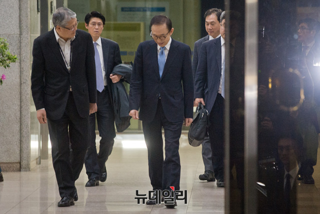 이명박 전 대통령이 15일 오전 서울 서초구 서울중앙지검 출석해 뇌물수수 및 직권남용 등의 혐의에 대해 21시간 동안 조사를 받고 귀가하고 있다. 이 전 대통령의 실제 조사는 14시간가량 이뤄졌지만 조서 열람에 6시간 넘게 소요된 것으로 알려졌다. 검찰은 이 전 대통령에 대한 조사 결과를 토대로 구속영장 청구 여부를 결정할 예정이다.(사진=사진공동취재단)