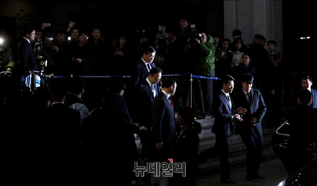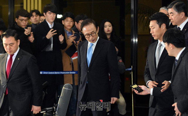 이명박 전 대통령이 15일 오전 서울 서초구 서울중앙지검 출석해 뇌물수수 및 직권남용 등의 혐의에 대해 21시간 동안 조사를 받고 귀가하고 있다. 이 전 대통령의 실제 조사는 14시간가량 이뤄졌지만 조서 열람에 6시간 넘게 소요된 것으로 알려졌다. 검찰은 이 전 대통령에 대한 조사 결과를 토대로 구속영장 청구 여부를 결정할 예정이다.(사진=사진공동취재단)