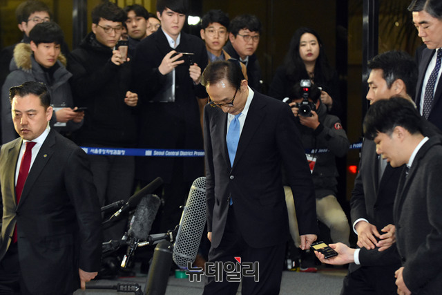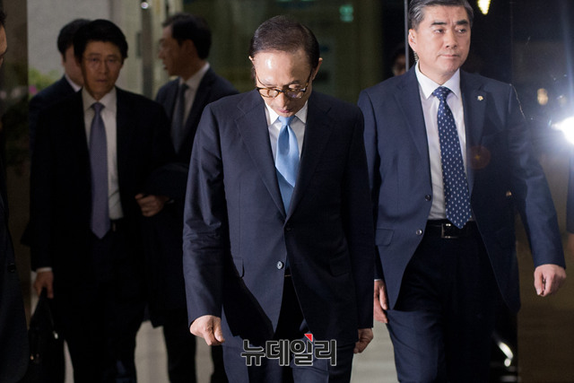 이명박 전 대통령이 15일 오전 서울 서초구 서울중앙지검 출석해 뇌물수수 및 직권남용 등의 혐의에 대해 21시간 동안 조사를 받고 귀가하고 있다. 이 전 대통령의 실제 조사는 14시간가량 이뤄졌지만 조서 열람에 6시간 넘게 소요된 것으로 알려졌다. 검찰은 이 전 대통령에 대한 조사 결과를 토대로 구속영장 청구 여부를 결정할 예정이다.(사진=사진공동취재단)