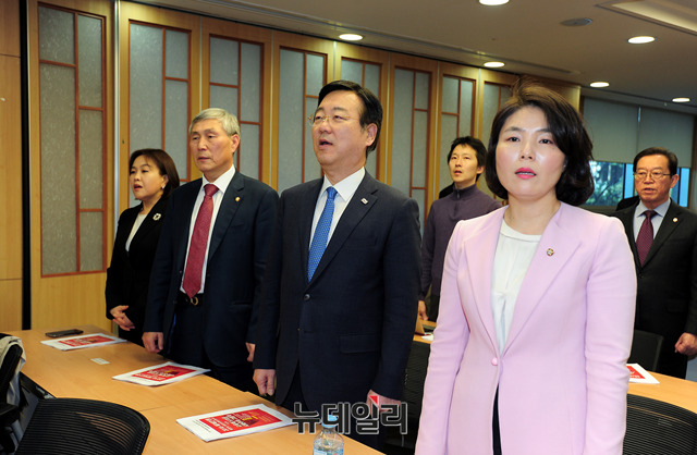 송희경, 조훈현, 김종석, 전희경, 이종배(왼쪽부터) 자유한국당 의원이 16일 오후 국회의원회관 세미나실에서 열린 '대한민국, 사회주의호에 오르는가-제3화 교육에 드리운 사회주의 그림자' 토론회에 참석해 국민의례를 하고 있다.