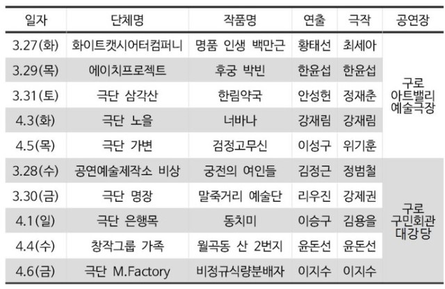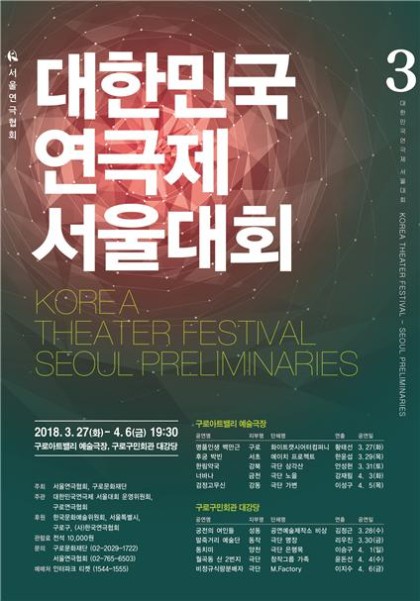 창작극 중심의 연극 축제가 12일간 펼쳐진다.서울연극협회(회장 송형종)와 구로문화재단(이사장 이성)이 공동 주최하는 제3회 대한민국연극제 서울대회(예술감독 정상철)가 3월 27일~4월 6일 구로아트밸리 예술극장과 구로구민회관 대강당에서 열린다.이번 축제는 현시대와 사회를 반영한 창작극의 활성화를 목표로 기획됐으며, 총 10개의 단체가 12일간 본선 진출 티켓을 놓고 예선 경쟁을 벌인다. 참여 극단들은 가족의 헌신적인 사랑과 애환을 담은 '가족극'과 일제강점기부터 최근까지 우리나라가 겪은 질곡의 역사를 담은 '역사극' 등의 작품들을 선보인다.축제의 첫 포문은 화이트캣시어터컴퍼니의 가족극 '명품인생 백만근'이 연다. 우리나라 70년대 경제 성장을 이끌면서 에너지산업의 주축을 이룬 광산 도시 이야기로 광부의 애환과 가족 사랑을 다룬다.이어 과거 여행을 통해 꼬여버린 운명의 실타래를 찾아 풀어가는 극단 노을의 '너바나', 6일 만에 부모를 잃고 고아가 된 삼남매의 가슴 아린 이야기를 그린 극단 은행목의 '동치미', 1982년 월곡동 산동네에 사는 연이네를 통해 가족의 소중함을 담은 창작그룹 가족의 '월곡단 산 2번지'가 공연된다.