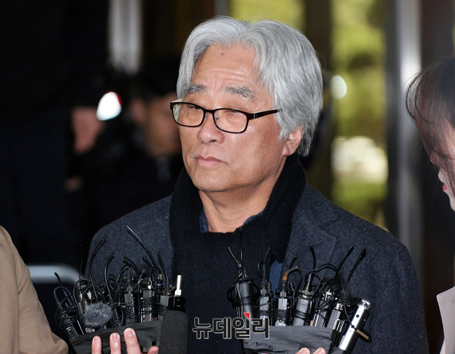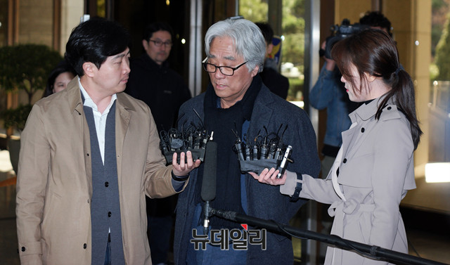 성폭력 혐의를 받고 있는 이윤택 전 연희단거리패 예술감독이 17일 오전 서울지방경찰청에 출석해 취재진의 질문을 받고 있다.
