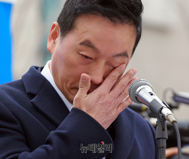 정봉주 전 통합민주당 의원이 18일 오전 서울 마포구 경의선숲길공원에서 서울시장 출마선언 도중 눈물을 닦고 있다.