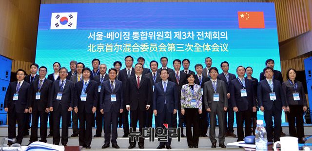 박원순 서울시장과 천지닝(陳吉寧) 중국 베이징시장이 19일 오전 서울시청에서 열린 '서울-베이징 통합위원회 3차 전체회의'에 참석해 기념촬영을 하고 있다. 이날 회의는 미세먼지 문제 공동 대응을 위해 기획됐다.