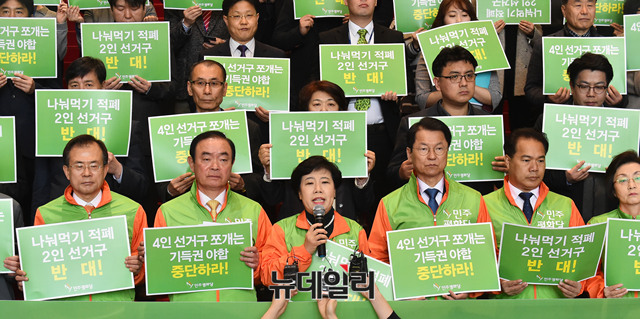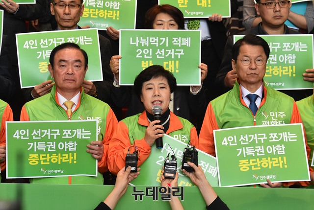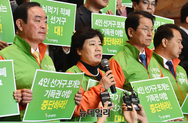 조배숙 민주평화당 대표가 20일 오전 국회 로텐더홀에서 더불어민주당과 자유한국당의 기초 광역의원 2인 선거구획정을 규탄하는 발언을 하고 있다.