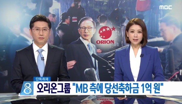 뉴스데스크는 "오리온의 한 전직 임원 A씨가 '이 전 대통령 쪽에서 요구가 먼저 있었고 그래서 사장이 돈을 마련하라고 지시했으며 자신이 돈을 직접 누군가에게 건넸다'고 밝혔다"면서 "지난 2008년 4월 이명박 전 대통령 측에 거액의 당선축하금을 전달한 사실을 털어놨다"고 보도했다.
