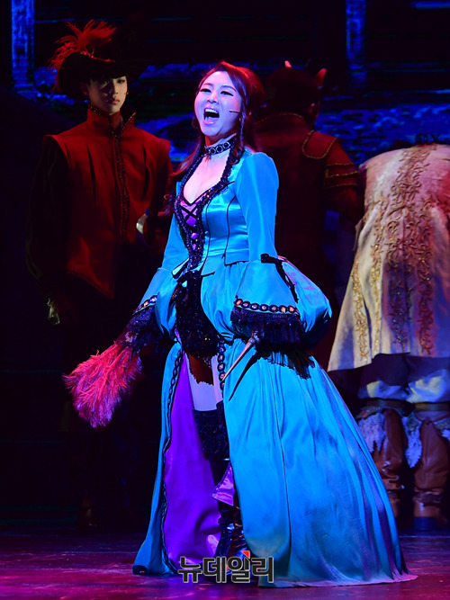 뮤지컬 배우 서지역이 20일 오후 서울 서초구 한전아트센터에서 열린 뮤지컬 삼총사 프레스콜에서 하이라이트 장면을 시연하고 있다. 서지영은 미모의 여간첩 밀라디 역을 맡았다.올해 10주년을 맞은 뮤지컬 '삼총사'는 알렉산드로 뒤마의 동명소설이 원작으로 17세기 프랑스 왕실 총사가 되기를 꿈꾸는 청년 달타냥과 전설적인 총사 아토스, 포르토스, 아라미스가 루이 13세를 둘러싼 음모를 밝혀내는 과정을 담았다. 오는 5월 27일까지 한전아트센터에서 공연된다.