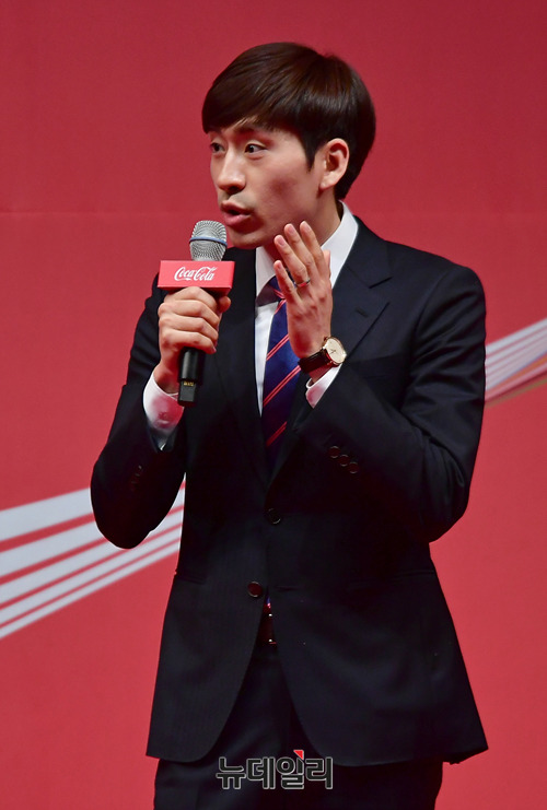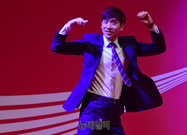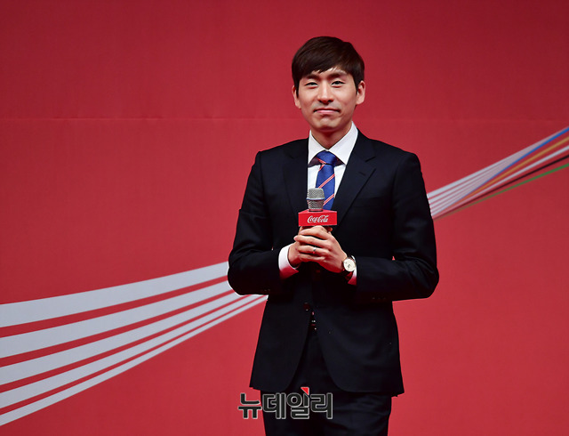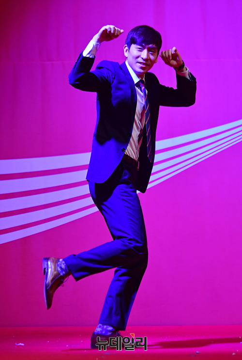 스피드스케이팅 이승훈 선수가 21일 오전 서울 웨스틴조선호텔에서 열린 '제 23회 코카-콜라 체육대상'에서 최우수상을 수상한 직후 춤을 추고있다.이번 시상식에서는 ▲ 최우수선수상 이승훈(스피드스케이팅), 윤성빈(스켈레톤) ▲ 우수선수상(비장애인부문) 최민정(쇼트트랙), 이상호(스노보드) ▲우수선수상(장애인부문) 신의현 (노르딕스키) ▲ 우수단체상봅슬레이 남자대표팀(원윤종, 서영우, 김동현, 전정린), 컬링 여자대표팀(김은정, 김영미, 김경애, 김선영, 김초희) ▲ 신인상 임효준(쇼트트랙), 안세현(수영) ▲우수지도자상 이용 한국 봅슬레이스켈레톤 대표팀총감독 ▲공로상 새라 머리 감독 및 아이스하키 여자대표팀 ▲특별상 이상화(스피드스케이팅) ▲클린스포츠상 쇼트트랙 여자대표팀(김아랑, 심석희, 최민정, 김예진, 이유빈) 등 총 9개 부문에서 상금과 상패가수여됐다.'코카-콜라 체육대상'은 1995년부터 대한민국 스포츠의 발전을 위해 기획한 아마추어 스포츠 시상식이다.