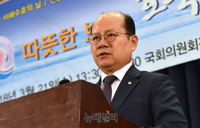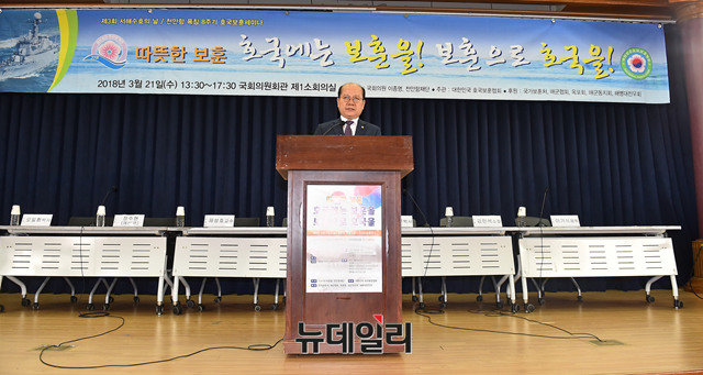 이종명 자유한국당 의원이 21일 오후 국회 의원회관에서 열린 서해수호의날 기념 '천안함 폭침 8주기 호국보훈세미나'에서 개회사를 하고 있다.