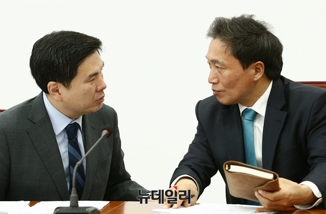 이학재-지상욱 바른미래당 의원의 23일 오전 국회에서 열린 최고위원회의에서 대화를 나누고 있다.