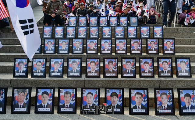 천안함 46용사 영정사진이 폭침 8주기를 앞둔 24일 오후 2시부터 서울역 광장 계단에 놓여있다. 이날 광장에는 박근혜 전 대통령 옥중투쟁을 지지하고, 천안함 8주기를 추모하고, 대통령 개헌안을 반대하는 태극기 집회가 진행중이다.