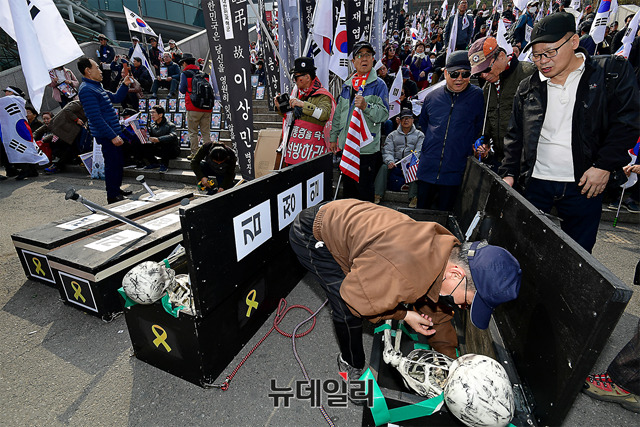 북한 김일성, 김정일, 김정은과 김영철의 이름을 단 관이 천안함 폭침 8주기를 앞둔 24일 오후 서울역 광장에 가두행진을 하기 위해 놓여있다. 이날 서울역 광장에는 박근혜 전 대통령 옥중투쟁을 지지하고, 천안함 8주기를 추모하고, 대통령 개헌안을 반대하는 태극기 집회가 열려 전국에서 이를 지지하는 시민들이 모였다.