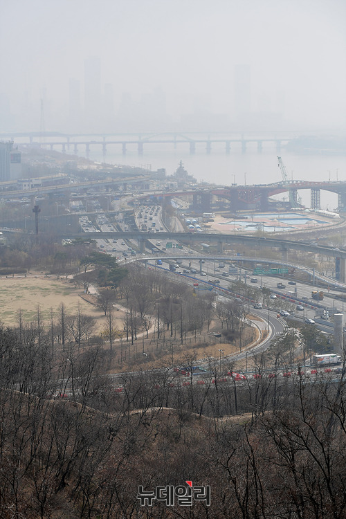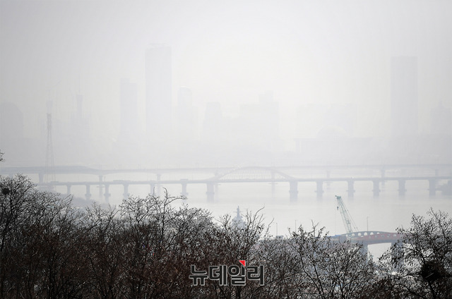 대기 정체로 미세먼지가 쌓인 26일 오후 서울 마포구 하늘공원 남측 전망대에서 여의도 국회의사당 방향으로 본 전경. 직선거리는 4km이지만 육안으로 식별이 불가능 할 정도로 대기질이 좋지 않다.
