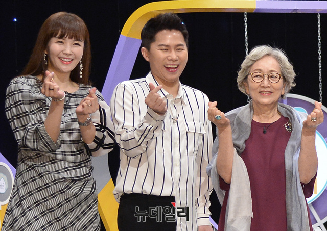 예능프로그램 '할머니네 똥강아지'의 출연자(장영란, 양세형, 김영옥, 강수지, 김국진)들이 26일 오후 서울 상암MBC에서 열린 기자간담회에 참석해 포즈를 취하고 있다.