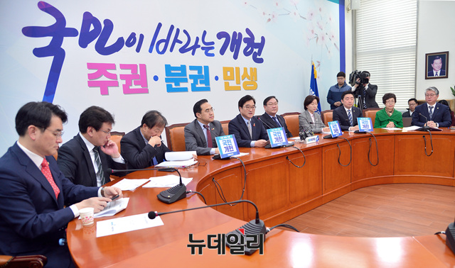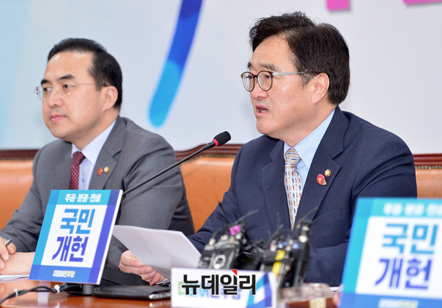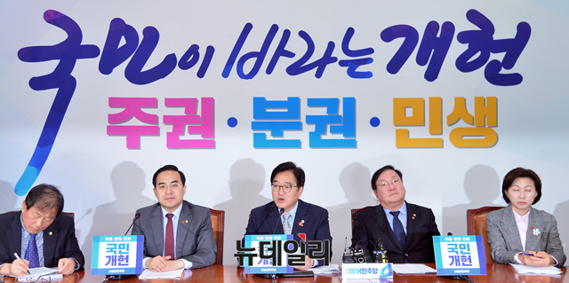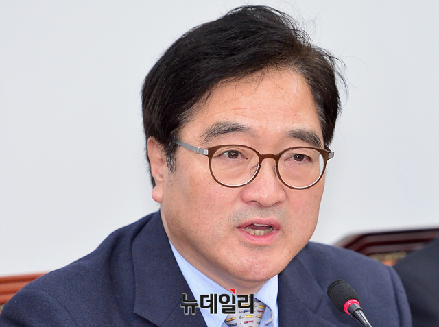 우원식 더불어민주당 원내대표가 27일 오전 국회에서 열린 원내대책회의에 참석해 발언하고 있다.
