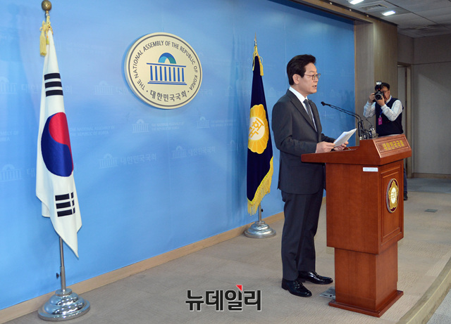이재명 성남시장이 27일 오전 국회 정론관에서 6·13 지방선거 경기도지사 출마 기자회견을 하고 있다.