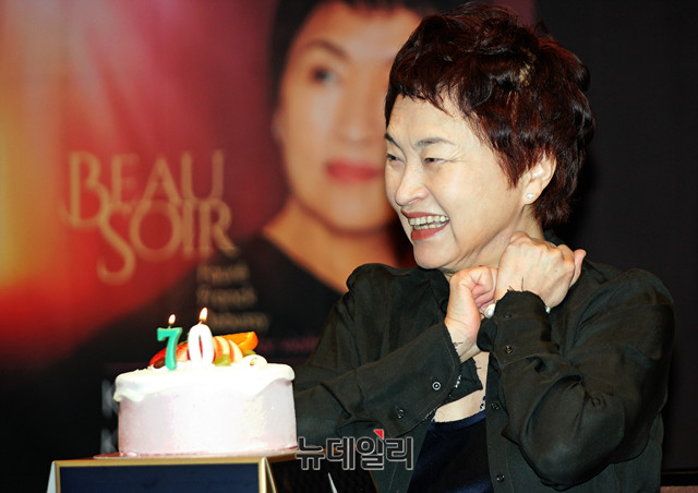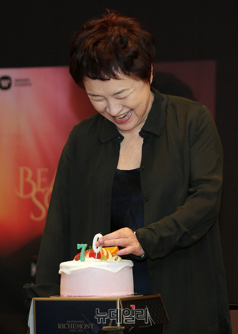 바이올리니스트 정경화가 27일 오전 서울 종로구 문호아트홀에서 열린 서른세 번째 정규 앨범 '아름다운 저녁(Beau Soir)' 발매 기자간담회서 70번째 생일을 축하하는 케이크를 보며 웃고 있다.