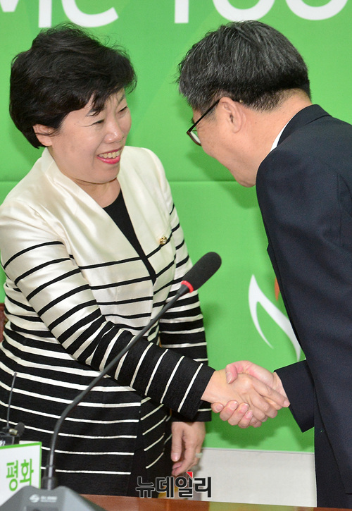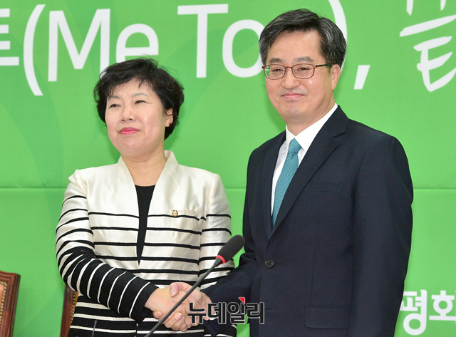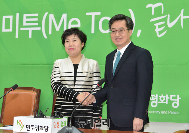 김동연 경제부총리 겸 기획재정부 장관이 27일 오후 국회를 방문해 조배숙 민주평화당 대표와 악수를 나누고 있다.