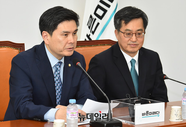 지상욱 바른미래당 정책위의장이 27일 오후 국회를 방문한 김동연 부총리 겸 기획재정부 장관에게 발언을 하고 있다.