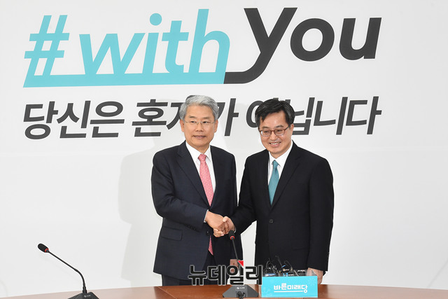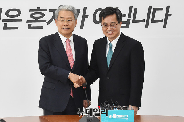 [포토] 악수 나누는 김동철 바른미래당 원내대표와 김동연 부총리