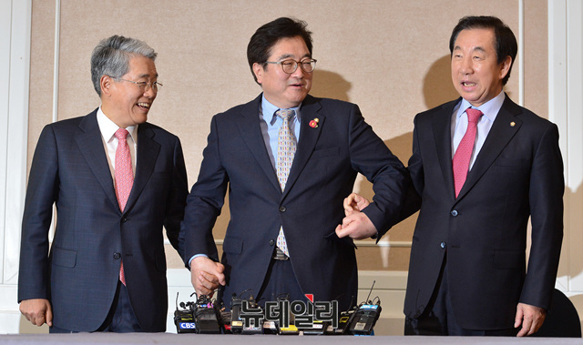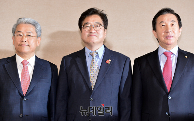 김성태 자유한국당, 우원식 더불어민주당, 김동철 바른미래당 원내대표가 27일 오후 국회에서 열린 3당 원내대표 개헌 관련 회동에 앞서 포즈를 취하고 있다.