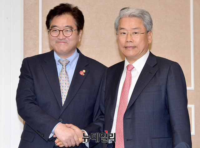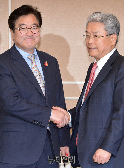 우원식 더불어민주당, 김동철 바른미래당 원내대표가 27일 오후 국회에서 열린 3당 원내대표 개헌 관련 회동에 앞서 악수를 나누고 있다.