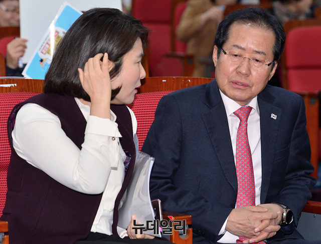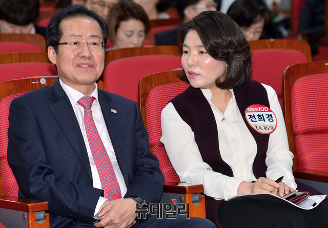 홍준표 자유한국당 대표와 전희경 의원이 28일 오전 국회 의원회관에서 열린 '진짜교육이야기 : 학부모100 토크콘서트'에 참석해 대화를 나누고 있다.