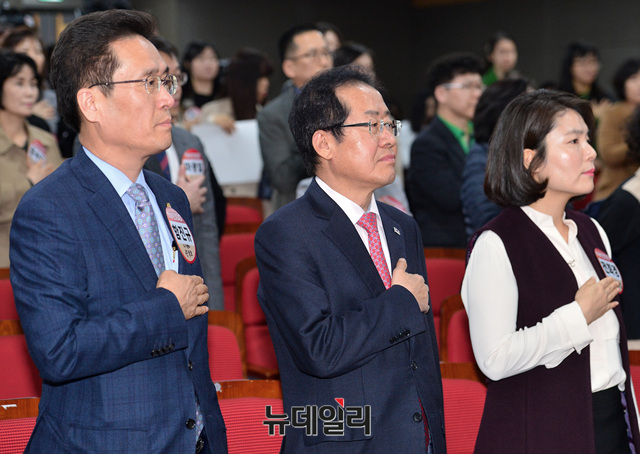 홍준표 자유한국당 대표, 함진규 정책위의장, 전희경 의원이 28일 오전 국회 의원회관에서 열린 '진짜교육이야기 : 학부모100 토크콘서트'에 참석해 국민의례를 하고 있다.