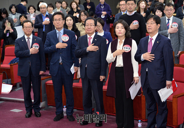 [포토] 국민의례 하는 홍준표-함진규-전희경