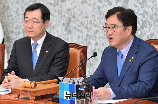 우원식 더불어민주당 원내대표가 28일 오전 국회에서 열린 최고위원회의에 참석해 모두발언 하고 있다.